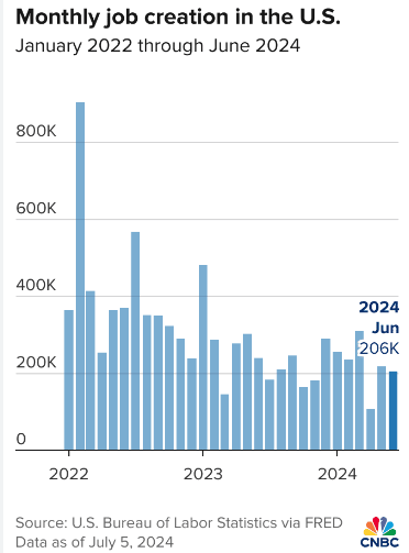 According to the Bureau of Labor Statistics (BLS), 206,000 jobs were added, meeting expectations. However, given the BLS’s tendency for revisions, April and May saw 111,000 fewer jobs combined. It is anticipated that June’s figures will also be revised downwards.