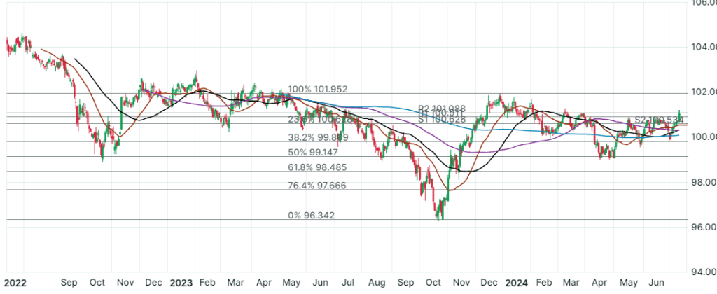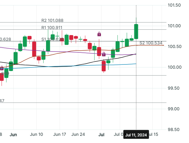 The chart below shows the movement of the UMBS 30-year Bond. An upward movement indicates lower rates. The difference between the red lower candlestick and the July 11th green candlestick reflects a 3/8th point decrease in interest rates.