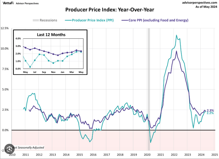 The Producer Price Index (PPI), which measures wholesale or producer inflation, rose by 0.4% in June, surpassing the expected 0.1%. Year-over-year, producer inflation increased from 2.4% to 2.6%.