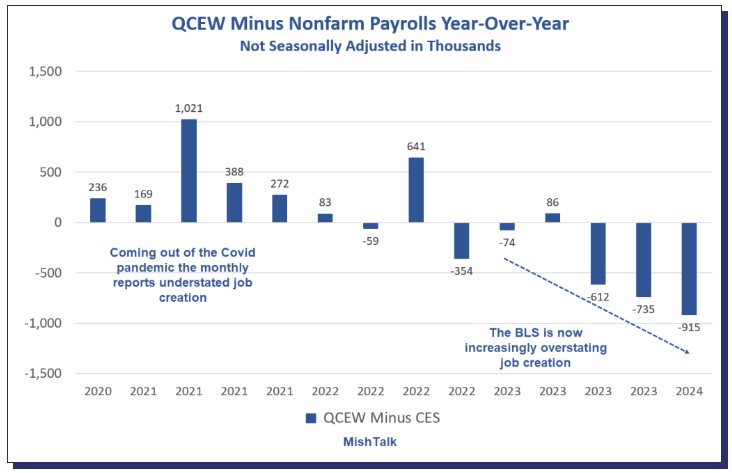 Job Data Revisions yet again. The Quarterly Census of Employment and Wages QCEW released their numbers and is showing more significant downward revisions in the labor market.