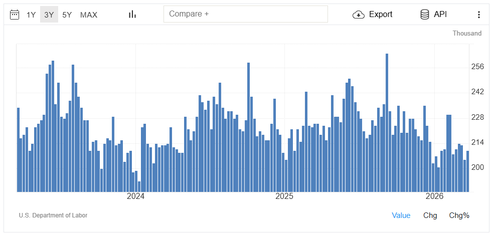 Continuing Claims fell by 32,000 to 1.82M. That decline could reflect people cycling off benefits, either because they’ve exhausted eligibility or are transitioning out of the system.