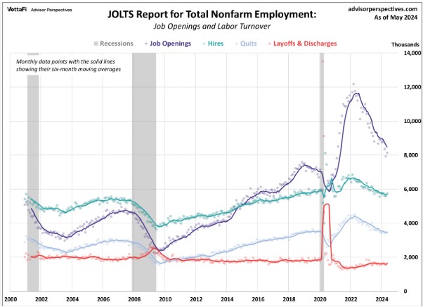 The June JOLTS data show job openings fell from 8.23M to 8.18M. For context we are above pre-pandemic levels, but remember the world has changed with our new work from anywhere issue of counting or double counting were the same job is listed in multiple states.
