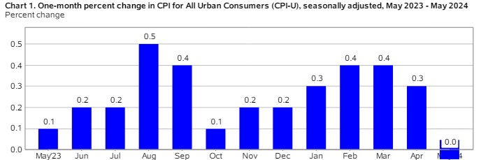 May Consumer Price Index (CPI) reported zero inflation for the month. The estimate was 0.1%. This is significant and a powerful indicator for the Feds to start lowering their rate.