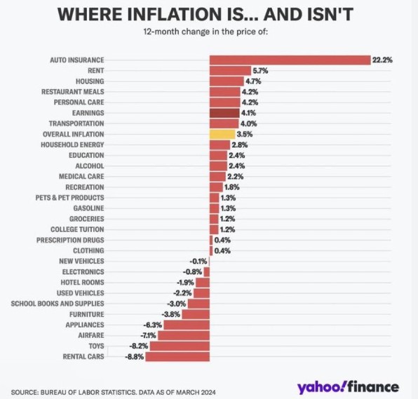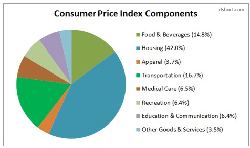 Take a look at the graph below. The top three items are Auto Insurance, Rent, and Housing. Housing and Transportation make up 58.7% of the Consumer Price Index (CPI).